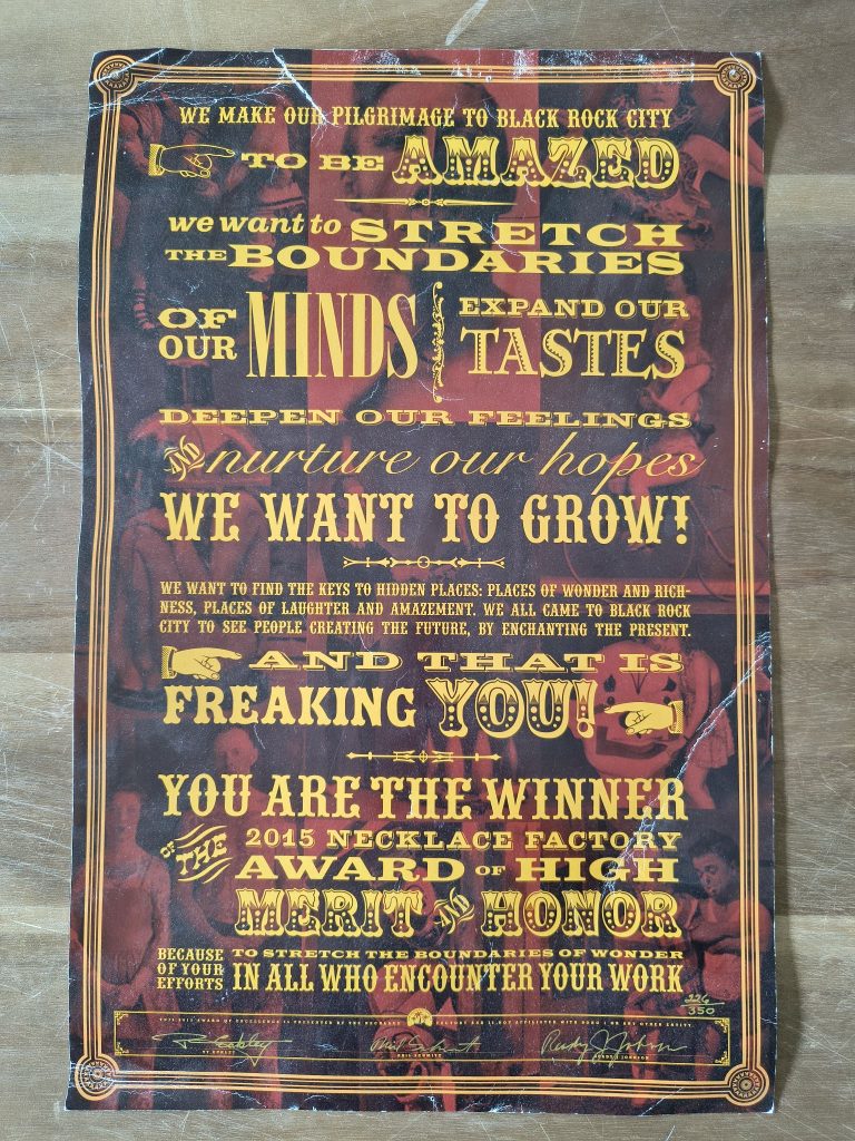 Our installation was honored with the Necklace Factory Award of High Merit, a recognition reserved for creators who expand the boundaries of artistic expression at Black Rock City. The award celebrated our contribution to the culture of amazement, exploration, and emotional resonance—acknowledging not just the artwork itself, but the spirit of engagement it sparked in everyone who encountered it. Receiving this medal and accompanying proclamation was a meaningful reminder of why we create: to inspire, to experiment, and to bring people together through transformative experiences.