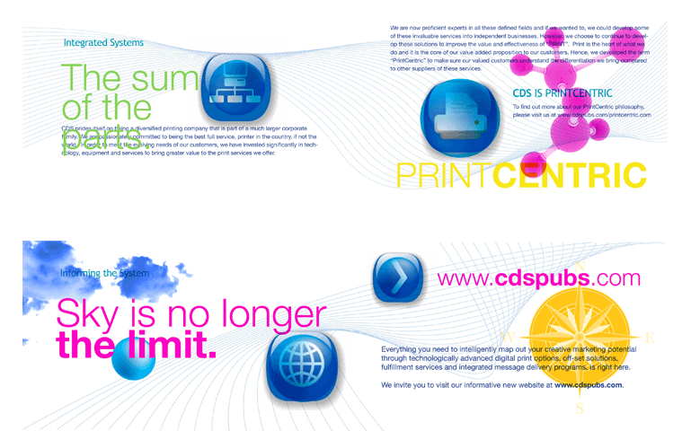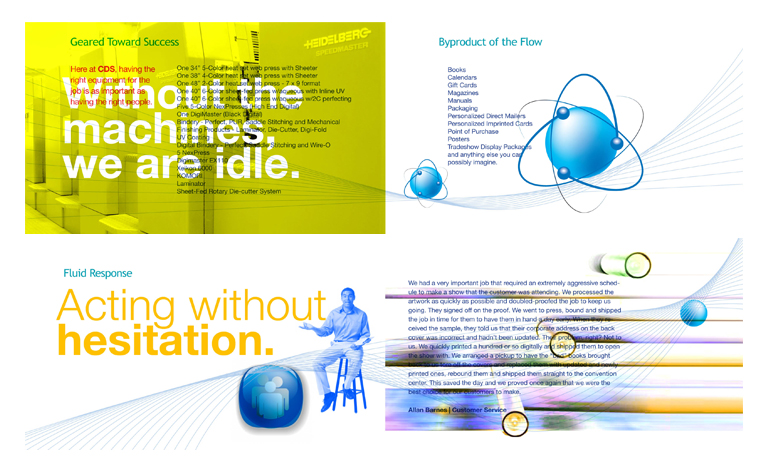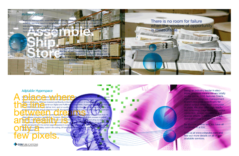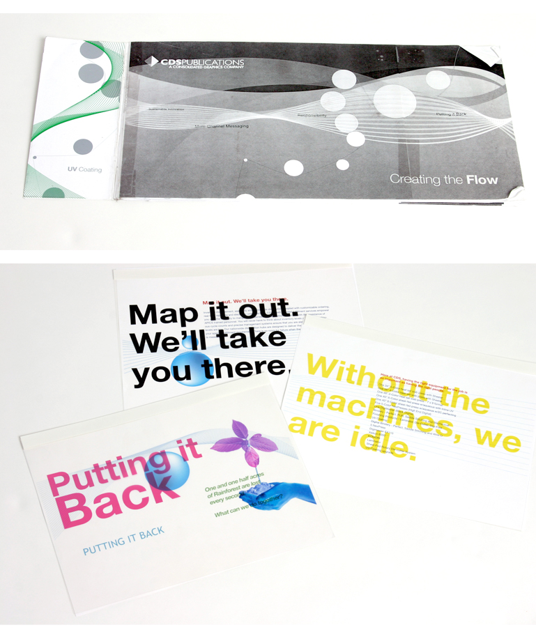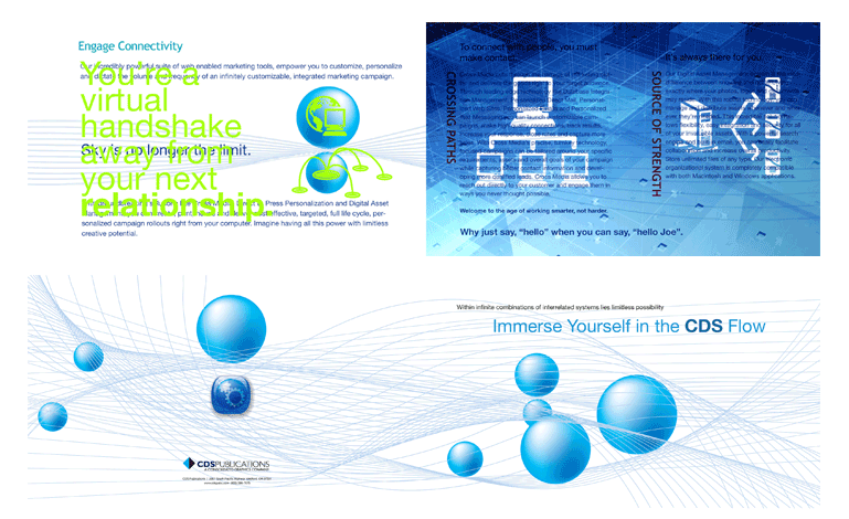 CDS Publications in Medford, Oregon had recently secured Apple as a major print client and needed a high-impact way to demonstrate their production quality and specialty printing techniques. I was brought in to develop a series of sample concepts, layouts, and visual directions that highlighted the capabilities of their presses, finishes, and materials.