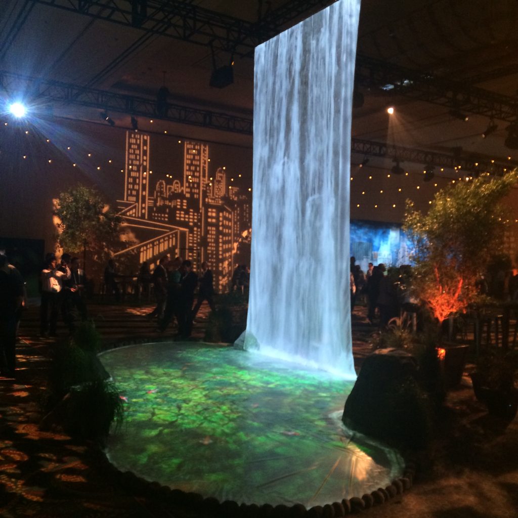 We engineered a multi-projector setup to simulate flowing water cascading down the central structure of the atrium. Complementing the waterfall, a digital koi pond projection reacted in real time to visitor movement — combining ambient lighting, motion design, and sound to create a serene yet futuristic environment.