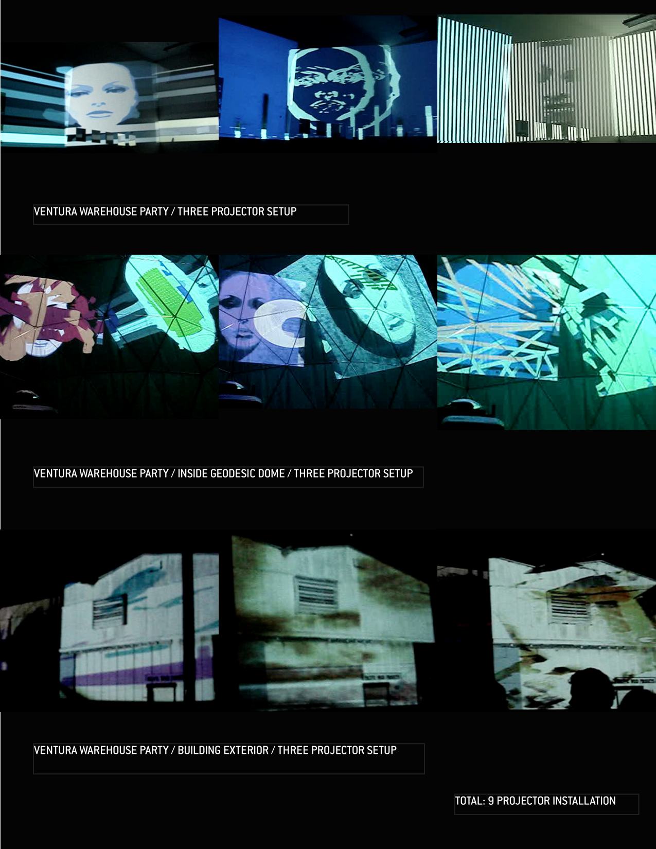 Designed improvised, multi-layered projection systems using analog distortion, camera feedback loops, surreal video textures, and custom content—often performed live with musicians or DJs.